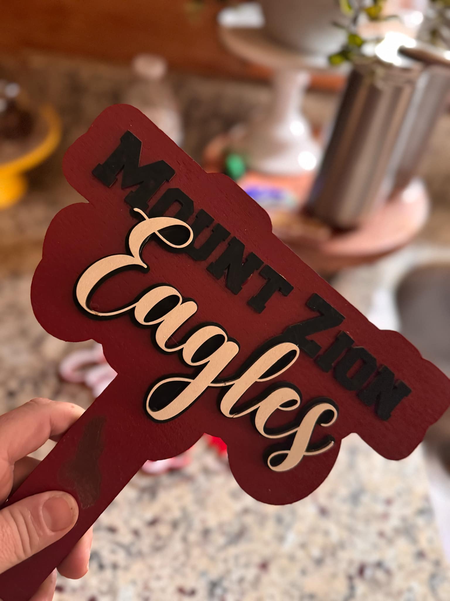 For those hot days and no wind, Stay cool with this wooden fan with your team's name and mascot in your team colors. The fan weighs about 1/4lb and is sturdy made of basswood with 3 layers and a hole and string for your wrist. Please provide your team name, mascot and colors when ordering.