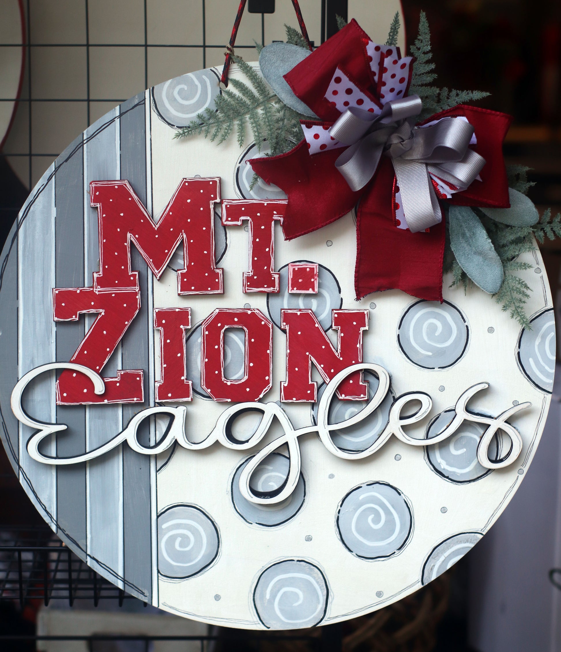 Add a splash of charm to your door with this playful wooden hanger featuring bold white, gray and red tones, large red wooden MtZion and fun white wooden cursive “EAGLES, on third layer.” Theside striped gray pattern add a fun twist, while the layered three-bow design and sturdy paracord/wire hanger complete the look for easy decorating. It’s a delightful way to welcome guests with style and personality!